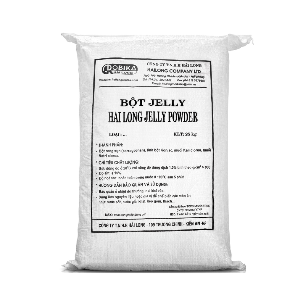 Bột Jelly Hải Long được sản xuất trên dây chuyền đã được cấp chứng chỉ HACCP về an toàn thực phẩm. Thành phần bao gồm bột rau sụn (Carrageenan) 50%, bột Konjac-gum (bột khoai sọ) 40 ~ 45%, muối Kali clorua (KCL) 10 ~ 15%.